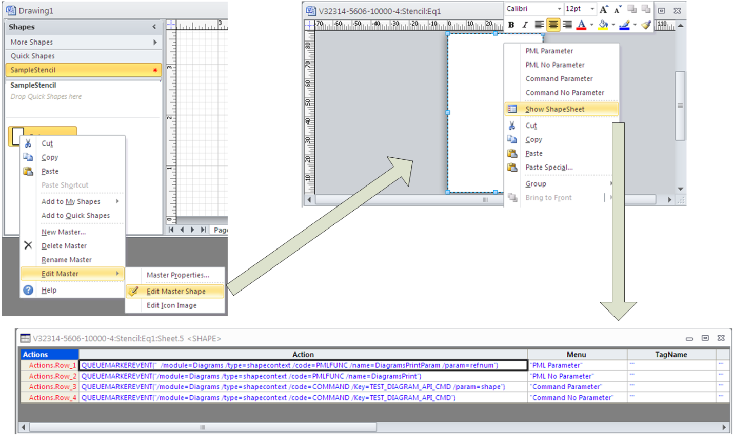 This mechanism is based on the Visio function QUEUEMARKEREVENT. This requires proper parameters that will be parsed when QueueMarkerEvent will be handled by the Diagrams application. According to parameters, the PML function or Command.Execute() will be called.