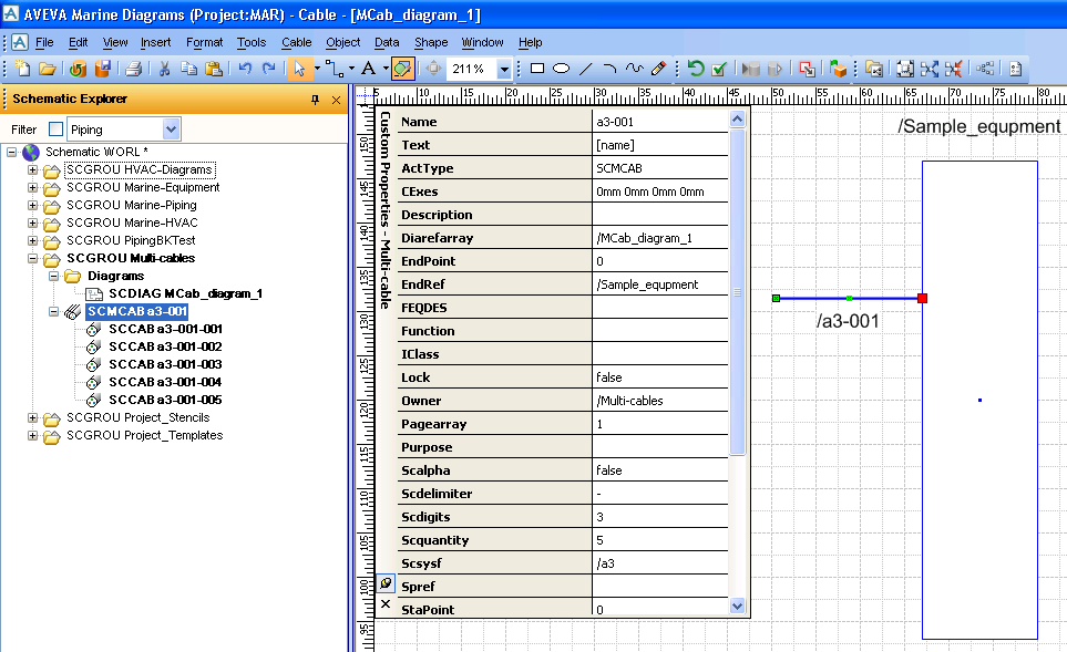 The number of cables represented by Multi-cable is controlled via its SCQUAN attribute. It can be set in the Shape Data window or directly on the command line. Connecting/disconnecting Multi-cable shapes to/from different db elements (equipments, sub-equipments, electrical connections) will cause changing STAREF/ENDREF of Multi-cable and all cables below it. Changes to Multi-cable attributes, except NAME, will override changes to Cable attributes.