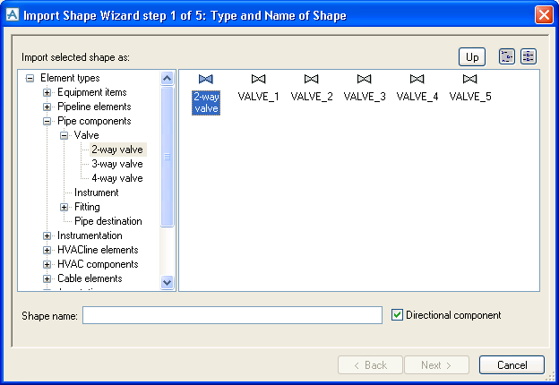 Inline parts can be defined as directional components. This means that the shape will always be adjusted to the flow of the branch. When such a shape is inserted into the tube, the application will check if its orientation is corresponding to the main flow and automatically reverse the direction of the component if needed. Such shapes can be used e.g. to represent non-returning valves.