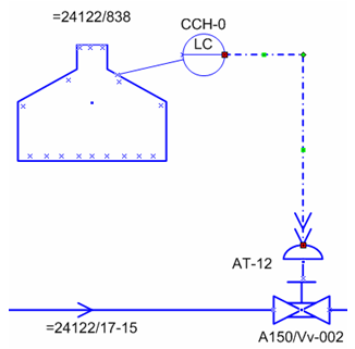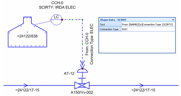 Instrument Relationship Shape does not represent a database element, but do represent a SCIREF between SCOINS and SCACTU. In the figure below, the dashed line represents a SCIREF from the SCOINS element at CCH-0 to the SCACTU representing the actuator at AT-12. The actuator has a SCIREF set to A150/Vv-002.