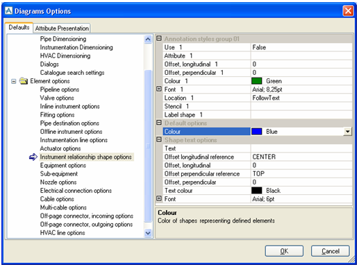 When Instrument Relationship Shape connects two valid items, it changes colour to ‘defined’. The colour can be determined in Diagrams Options: