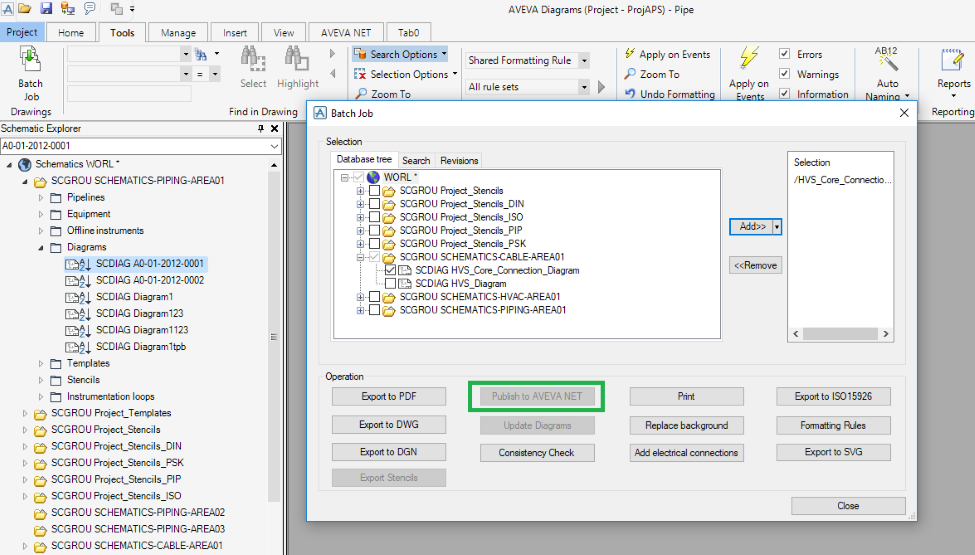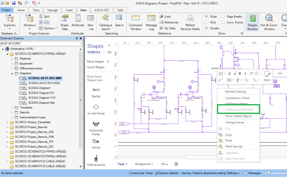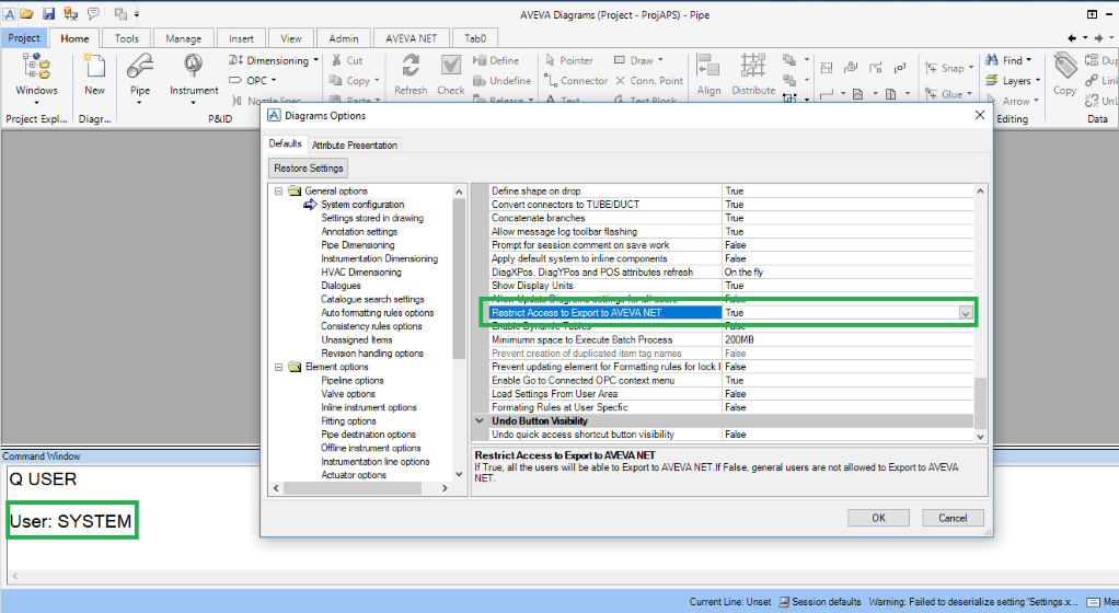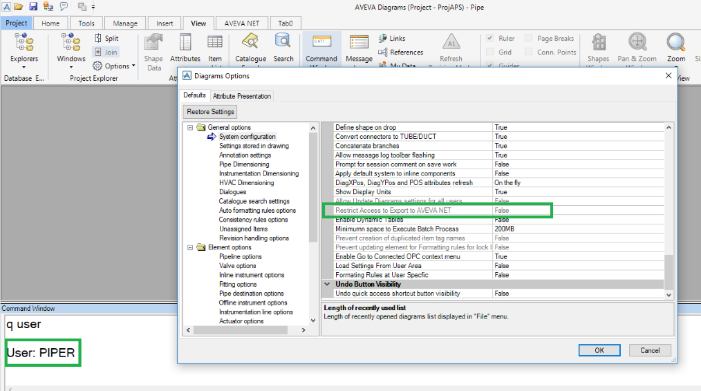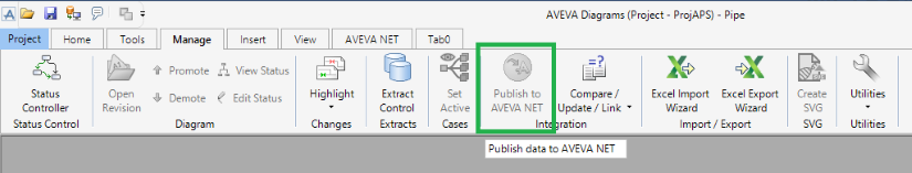 If the option is set to True and AVEVA NET Gateways is installed, all the options to publish to AVEVA NET, which are available in the Diagrams application, are enabled.