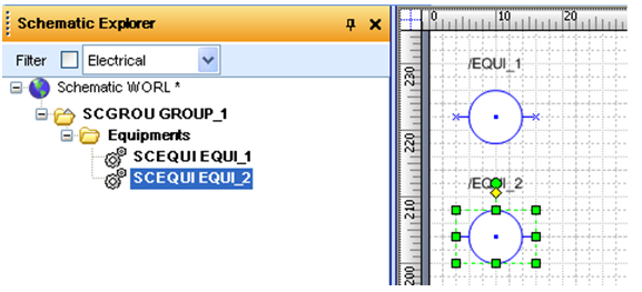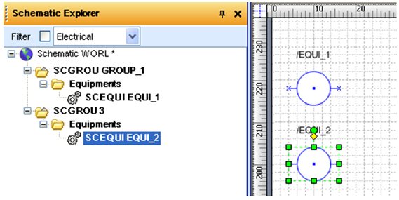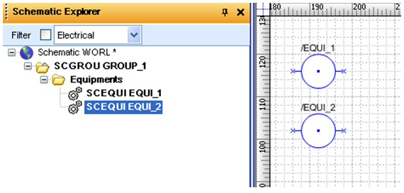 This setting is valid only when user set “Destination group hierarchy” setting to “Same as source groups”. It determines whether items should be created under new groups or under existing one with the same name (the actual type is not obligatory, only base type must be the same). I.E. When user copy equipment “EQUI_1” that is defined under “GROUP_1” from project “A” to project “B” then in project “B” new SCGROUP will be created with the same name (if auto name is disabled, see “Elements Name”). Next user copy “EQUI_2” that was defined under “GROUP_1” from project “A” to project “B” (situation in project A is presented on image 11). Depends on this option, system can create new group with default name and define “EQUI_2” under it, or system can use existing group as owner for pasted equipment (see below images).