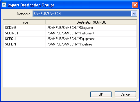 The Database field displays the name of the current Schematic database. To view/change the import destination groups of another database, select it from the drop-down list. The list consists of every Schematic database in the MDB.