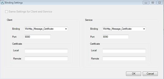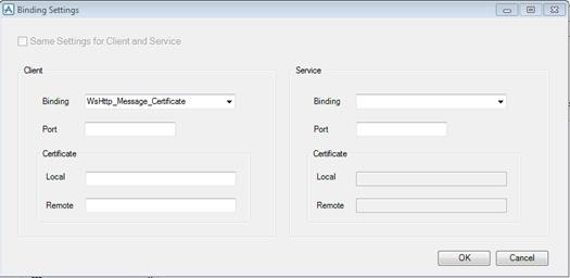 In the above example, because Client protocol binding uses a certificate, the form de-activates the "Same Setting for Client and Services" tick box. Selecting a Service protocol with certificate would active the service certificate fields.