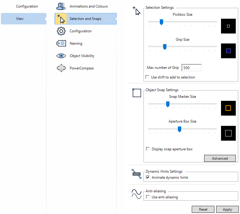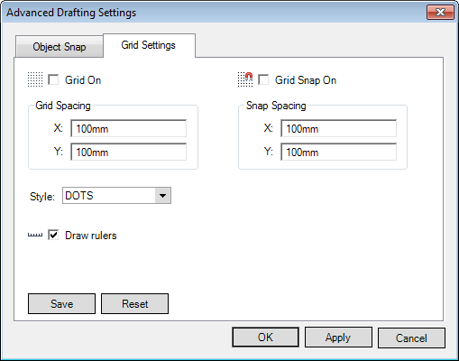 Allows you to specify the Object Snap settings and Grid settings. Refer to Advanced Drafting Settings for further information.