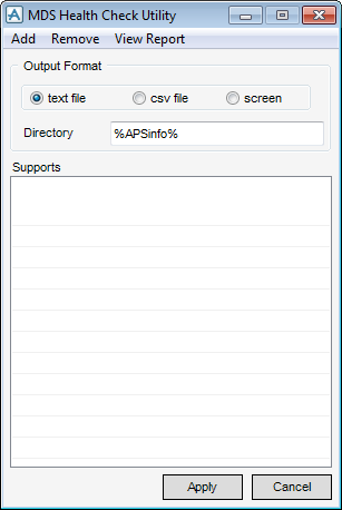 On the Supports tab, in the Tools group, click Health Check to display the MDS Health Check Utility window.
