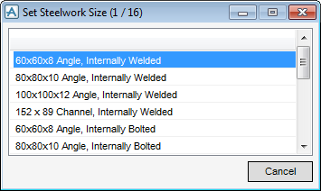 Select a template available from the list presented on the window (Figure 2:4.: Set Steelwork Size window). The template list shows all available templates. For this exercise, choose the second option, 80x80x10 Angle, Internally Welded.