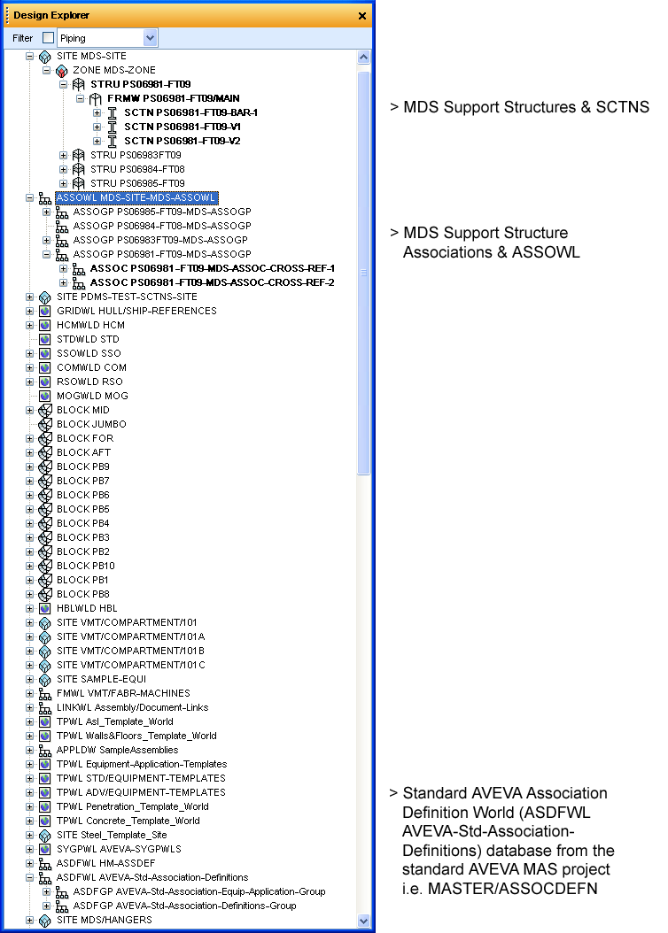 The MDS Structural Associations are automatically generated for the MDS support, shown in the picture above, in a ASSOWL element created automatically and named to reflect the SITE name where the MDS supports are being created, i.e. the ASSOWL name will follow the convention <sitename>-MDS-ASSOWL.