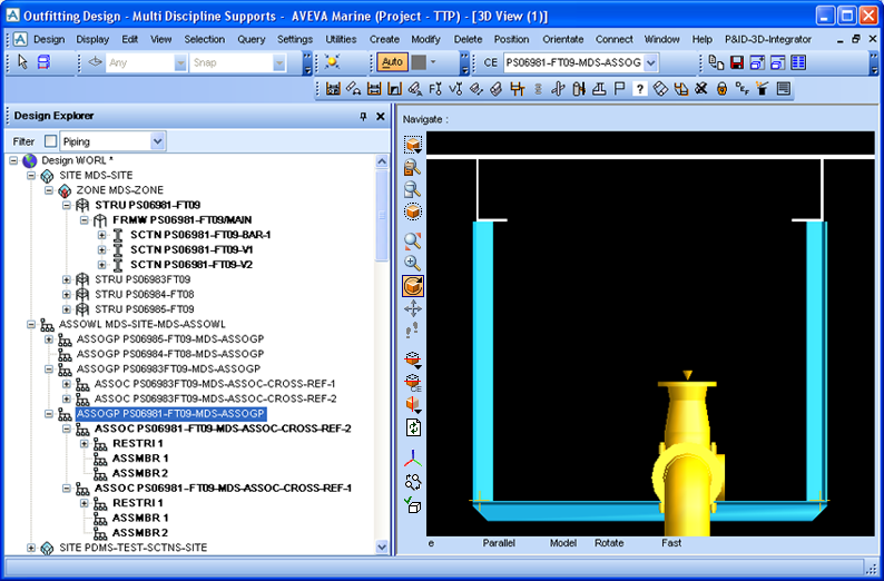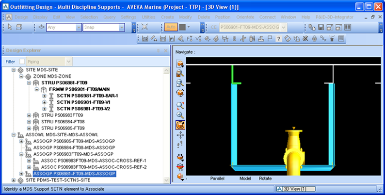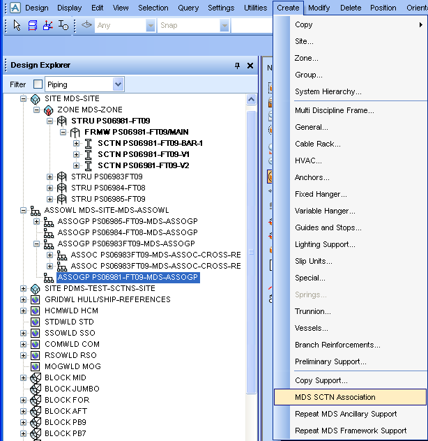 When the two vertical MDS SCTNS have been associated with the relevant MAIN structural elements, the Association Group (ASSOGP) hierarchy for the MDS support will be populated with the Association (ASSOC) elements etc…, as shown in the figure below: