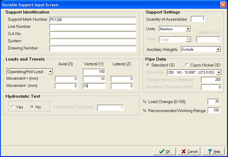 Enter the required Operating/Hot Load value and the positive and negative Movement required for the Axial (X), Vertical (V) and Lateral (Z) directions.