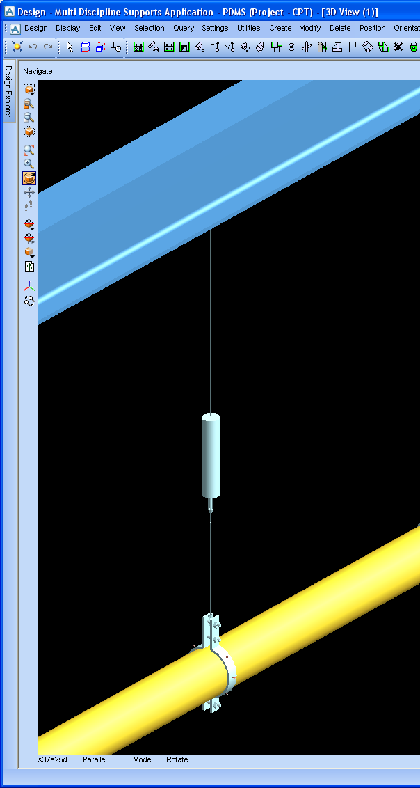 Select the Save icon to save the completed hanger design, exit the Witch Hanger application and return to the MDS application. The hanger data is translated and created into MDS hanger components, as shown in the 3D view.