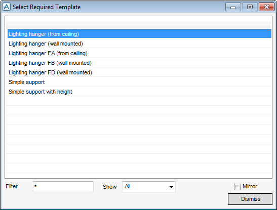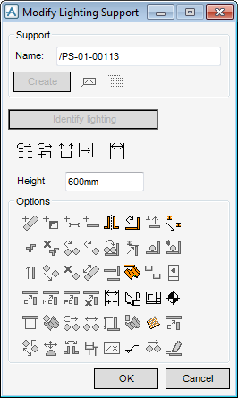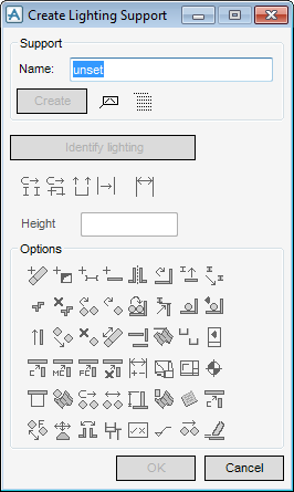Select a template by clicking on it, then click Dismiss. The selection is accepted, the window is removed and the lighting support creation window is switched to modify mode, as shown in Figure 8:2.: Modify Lighting Support window.