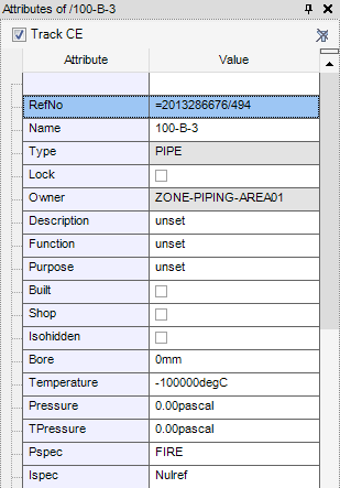 To view the pipe attributes, with the pipe selected as the CE, on the Piping tab, in the