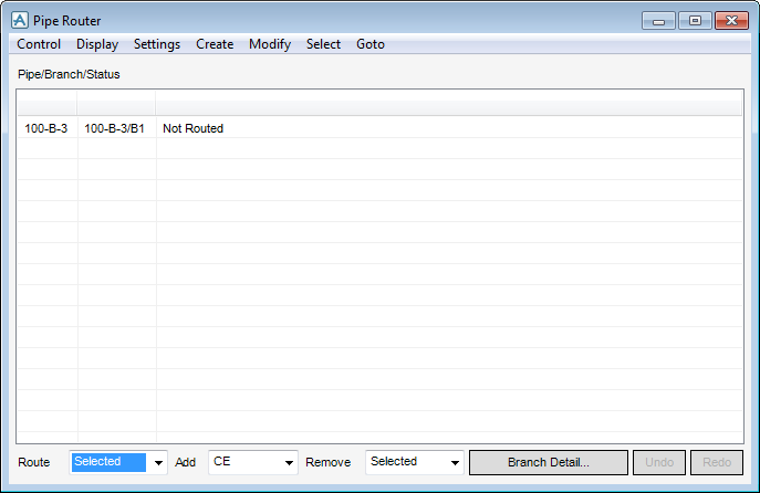 Once the pipe(s) have been routed, the user can check the status of the branch, by selecting Display > Status Summary from the