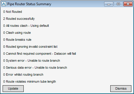 Update and Dismiss at the bottom of the Pipe Router Status Summary window can be used to update the report file or close the Pipe Router Status Summary window.