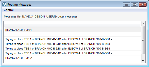 As Pipe Router routes a pipe, it examines each branch and generates a message about any routing errors that it finds. These messages can help the user understand and correct errors. It can view these messages both during and after pipe routing, providing the user has set up a file in which to store the messages, as described previously