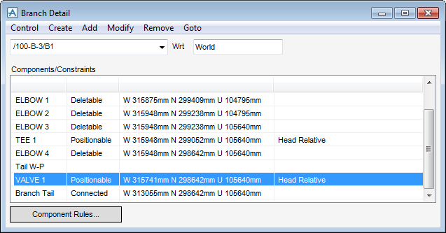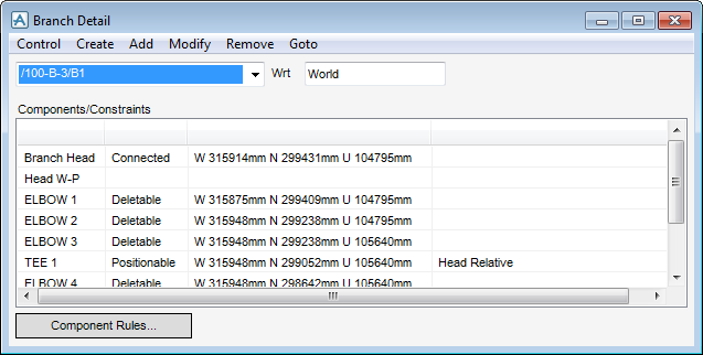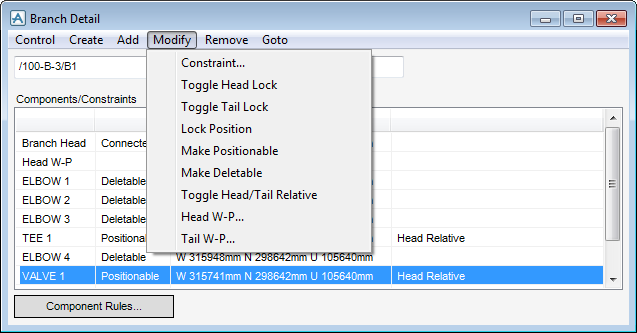 Pipe Router sees all piping components as deletable, positionable or locked. If the Branch Detail window displays for a Branch that has been routed by the Pipe