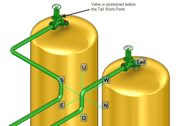 Pipe Router re-routes the Pipe from the Head Work-point to the Tail Work-point, which is now positioned before VALV 1.