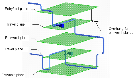 travel planes. For each level of a pipe rack, a travel plane must be created to control the direction in which pipes travel along the rack and at least one entry/exit plane to make sure that pipes enter onto and exit from the rack perpendicularly, either from above or below. Each pipe rack must have at least one travel plane and at least one entry/exit plane. The direction of travel is the X direction (length) for travel planes and the Y direction (width) for entry and exit planes.