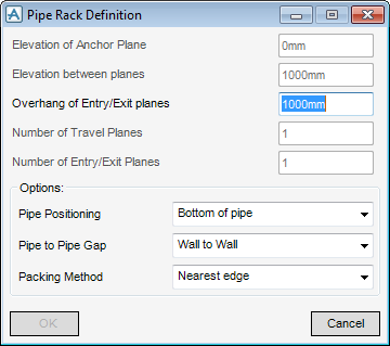 set the options on the Pipe Rack Definition window, when the user creates a pipe rack. The user can also change the settings for an existing Pipe Rack on the