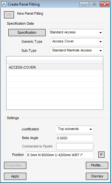 The Create Panel Fitting window allows the user access to all available panel fitting specifications in the current catalogue. As a new panel fitting is created, rather than modify the specification of a panel that already exists, by default the window is set as a New Panel Fitting as the current element.