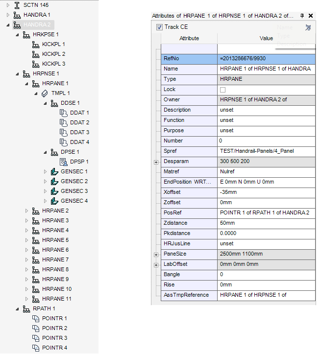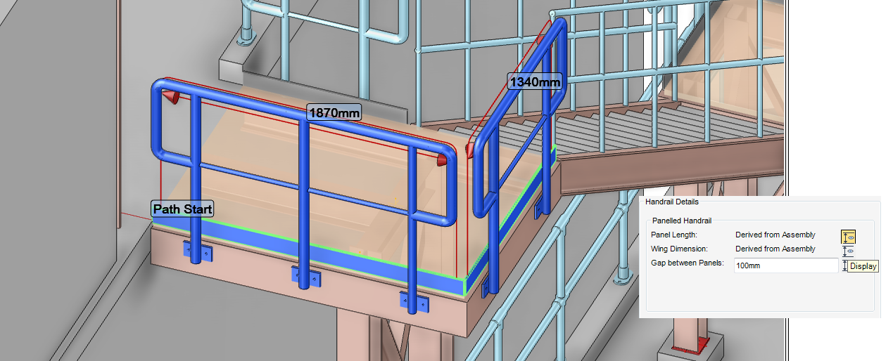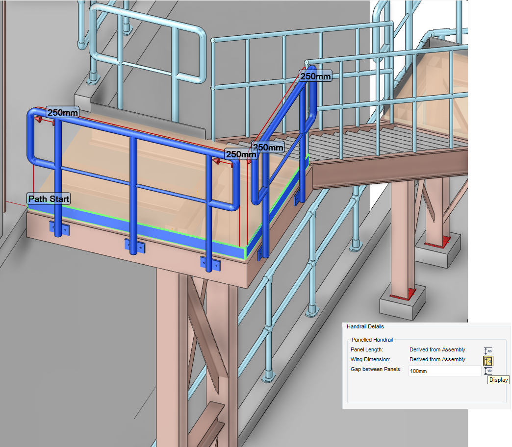 Panelled assembly handrails are available for selection, the panels are sized and positioned along the selected route path.