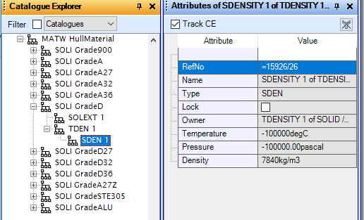 Material quality needs to be stored in AVEVA Catalogue Application in PROP (Property Database). A hull material is defined by a SOLI element with a SOLEXT element used for additional information and a TDEN and SDEN element defining density of the material.