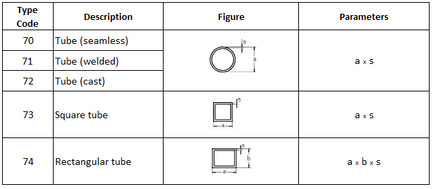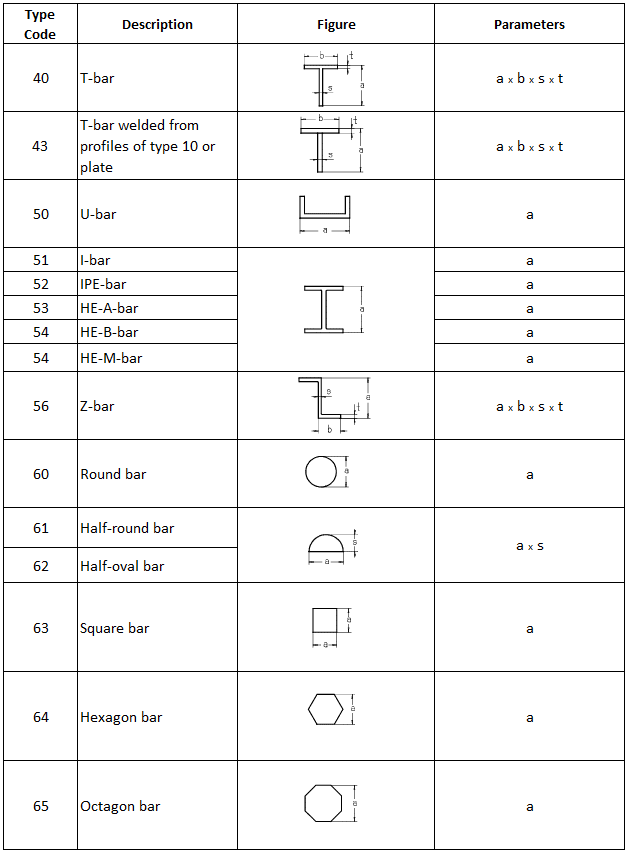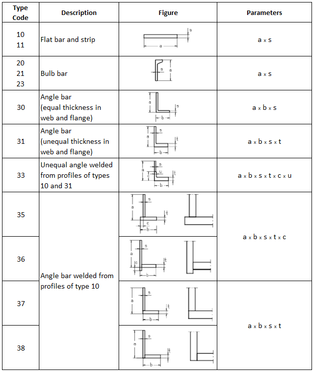 The table below specifies the profile types normally used in shipbuilding. It shows the profile type, its cross-section and the parameters that are required to control the size of the profile section. When selecting a certain profile, it is important that the correct number of parameters is given in the order specified in the table.