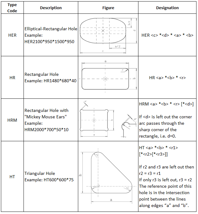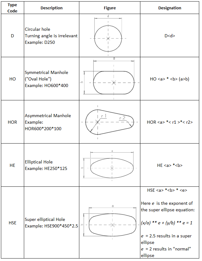 In the specification of the different hole types the figures show the shape of the holes, their local co-ordinate system and thus their reference point. The figures also show how the holes will be oriented if no turning angle is specified.