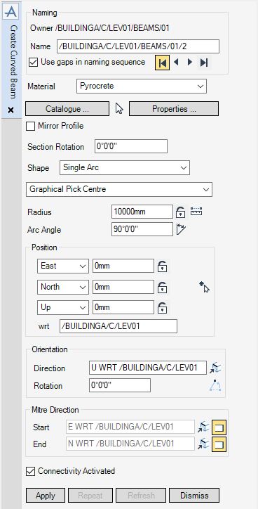 It is also possible to create a curved beam with AVEVA E3D™ using the Sections application. On the Sections tab, in the Create group, click Curved.